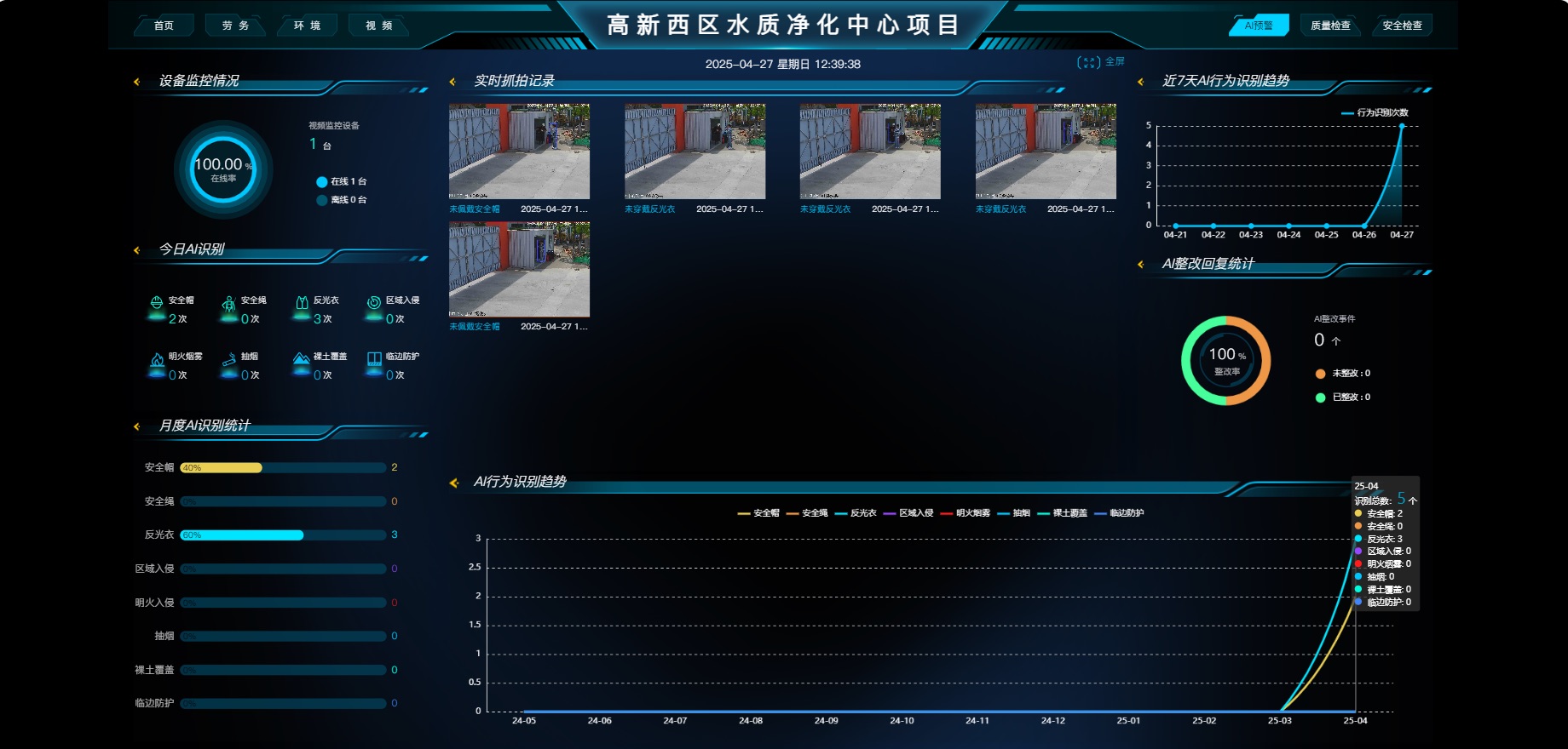 AI視頻監(jiān)控系統(tǒng)AI視頻監(jiān)控系統(tǒng)通過覆蓋施工面的高清攝像頭群,搭載行為識別算法引擎。系統(tǒng)實時分析視頻流,自動檢測未系安全帶、違規(guī)攀爬、闖入禁區(qū)等20余類高風(fēng)險行為。一旦識別到違規(guī)操作,立即定位人員位置并同步推送告警信息至安全員手持終端,實現(xiàn)從被動監(jiān)控到主動干預(yù)的升級。